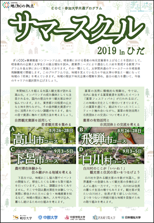 その一環として、今年度は、参加大学共通のサマースクールを岐阜県飛騨圏域で開催します。このプログラムでは、地域を支えている方々や他大学の学生と一緒になって地域の「将来」を考えていきます。地域の現状や地元企業の理解を深め、自分の能力を磨いて、今後のキャリアの選択肢を広げましょう。