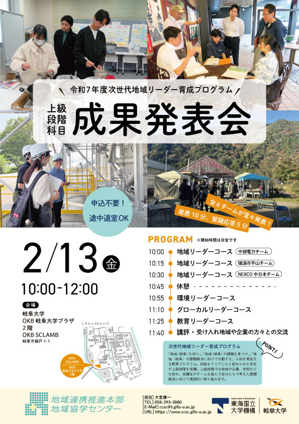 岐阜大学では地域で実践的に活躍し、地域の中でリーダーシップを発揮できる人材ならびにリーダーを支援する人材である「次世代地域リーダー」、「次世代産業リーダー」、「次世代教育リーダー」、「次世代環境リーダー」及び「次世代グローカルリーダー」を育成・輩出することを目的・目標とする教育プログラムを展開しています。