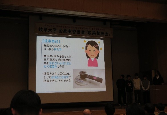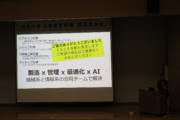 その後、地域協学センターの塚本准教授が授業「地域産業と企業戦略入門」における県内企業の取材を通じた学びの成果を報告しました。続いて26の学生グループが企業実習での成果を発表しました。学生からは「岐阜県内の企業活動を深く知る貴重な機会となった」などの感想が寄せられました。