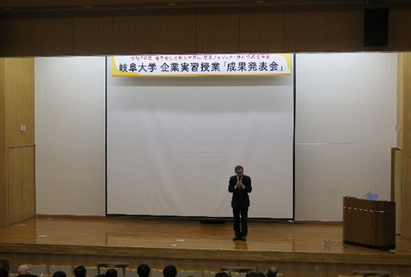 発表会で、王副学長は「このプロジェクトは10年目の節目を迎えました。実習を通して、学生たちはものづくりの楽しさと難しさを理解するとともに県内企業の技術力の高さを体感できたのではないかと思います。イノベーション創出のための人材育成には、大学の教育だけでなく、産業界をはじめ多くの方々の協力が必要不可欠です。今後とも本学に課題等を投げかけていただき、皆様と連携してこのプロジェクトを盛り上げていきたいと思っています」と述べました。続いて、岐阜県産業人材課土田課長より「地元就職者の育成と定着には、関係者一丸となって取り組むことが必要です。10年続いたこのプロジェクトは非常に意義深く、重要な事業です」とご挨拶いただきました。