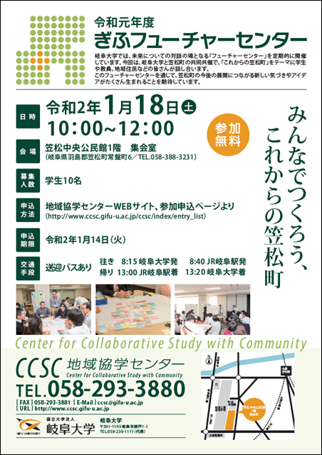 今回のフューチャーセンターは、岐阜大学と笠松町の共同共催で、「これからの笠松町」をテーマに学生や教員、地域住民などの皆さんが話し合います。